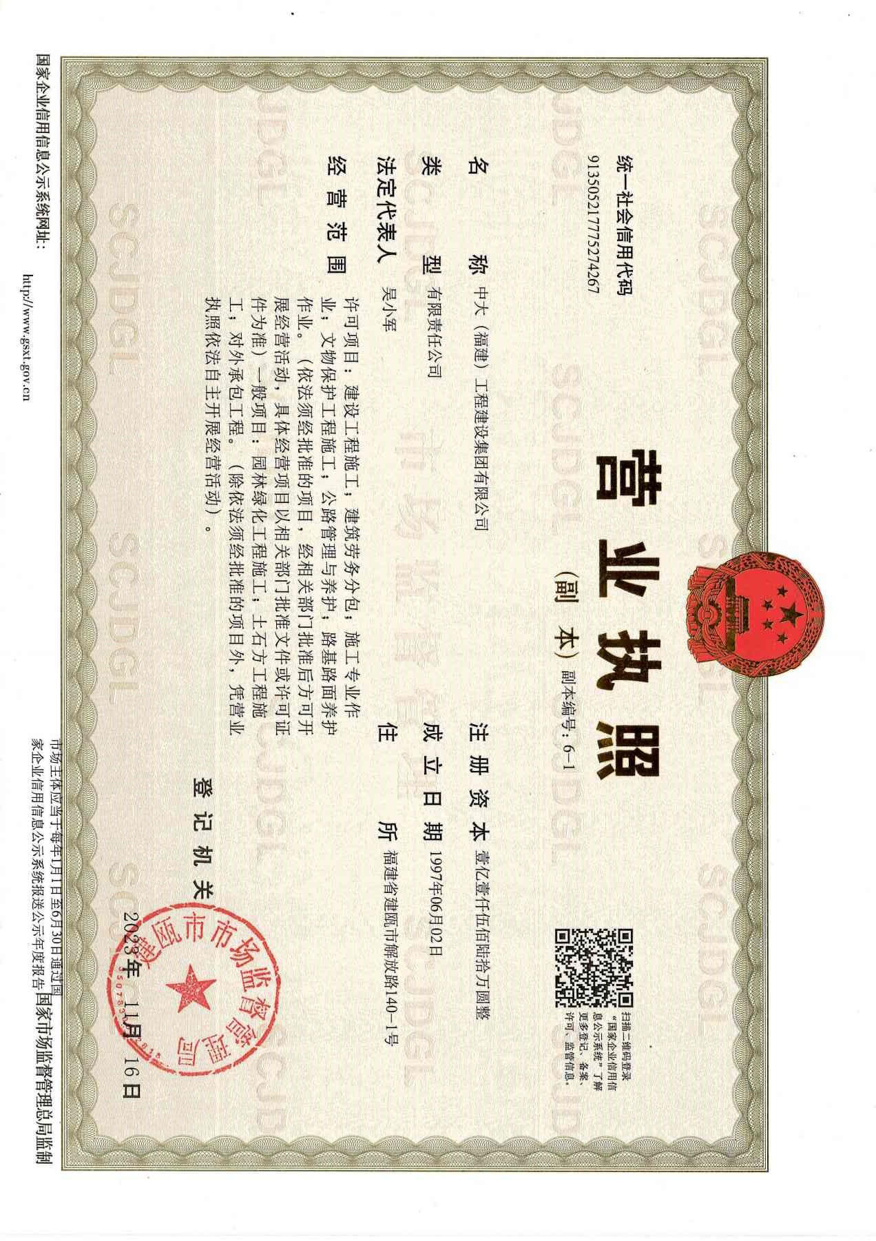 中大(福建)工程建設(shè)集團(tuán)有限公司始建于1997年,總部設(shè)在“中國(guó)筍竹之都”——福建省南平市建甌市。公司注冊(cè)資本金11560萬(wàn)元,年施工產(chǎn)值15億元以上。現(xiàn)有公司資質(zhì):房屋建筑工程施工總承包一級(jí)、市政公用工程施工總承包一級(jí)、地基基礎(chǔ)工程專業(yè)承包壹級(jí)、消防設(shè)施工程專業(yè)承包壹級(jí)、建筑裝修裝飾工程專業(yè)承包壹級(jí)、建筑機(jī)電安裝工程專業(yè)承包壹級(jí)、環(huán)保工程專業(yè)承包壹級(jí),并取得質(zhì)量、環(huán)境和職業(yè)健康安全管理體系認(rèn)證。